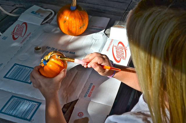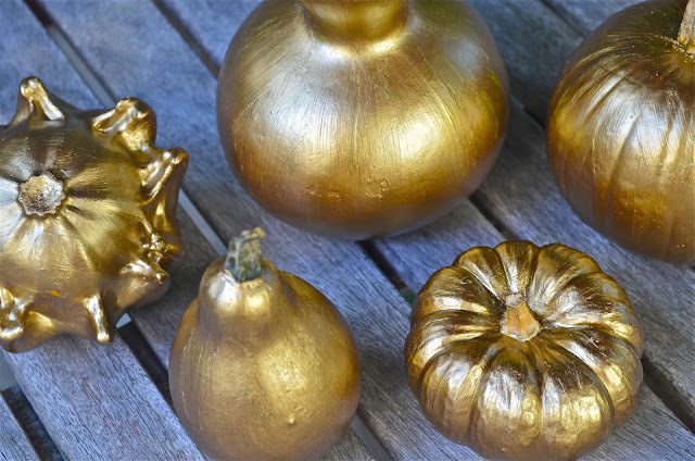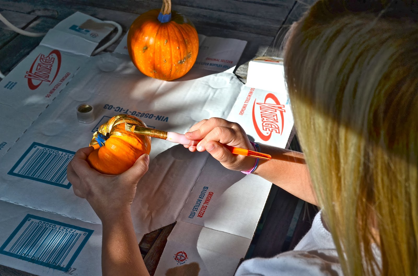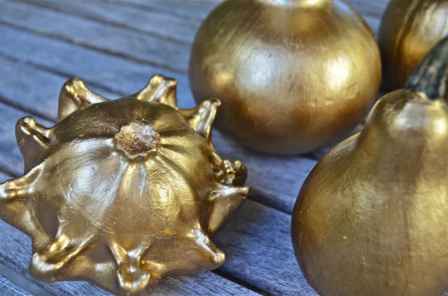 While in Vermont last month we bought a bundle of uniquely shaped gourds and a few big pumpkins for the front porch. The gourds are beautiful in their natural state but I thought sprucing them up a bit would instantaneously turn them into “holiday” decorations. Let’s be honest – decorating is not my forté. I had to really pat myself on the back after I Emma turned these traditional gourds into “golden beauties”.