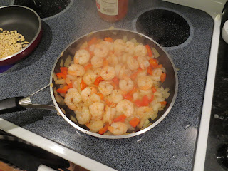 I always keep deveined and shelled shrimp in the freezer. Thaws quickly and cooks even faster. Once the peppers and onions had been peppered and salted I added the shrimp.