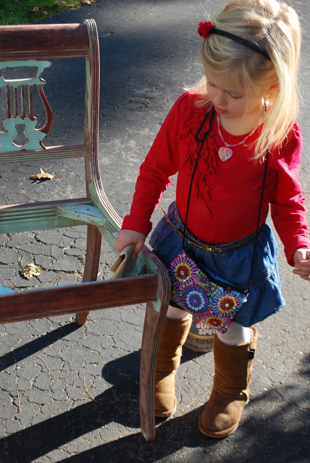 At this point you might be thinking “Does this woman not worry about exposure to lead paint?!?!” I do! But I was pretty far into the project before I really realized what I was dealing with. And lest you all think I am a terrible mother – Emma had that sandpaper in her hand for no more than 2 minutes. Most of my sanding was done alone, after bedtime, while John watched SportsCenter.