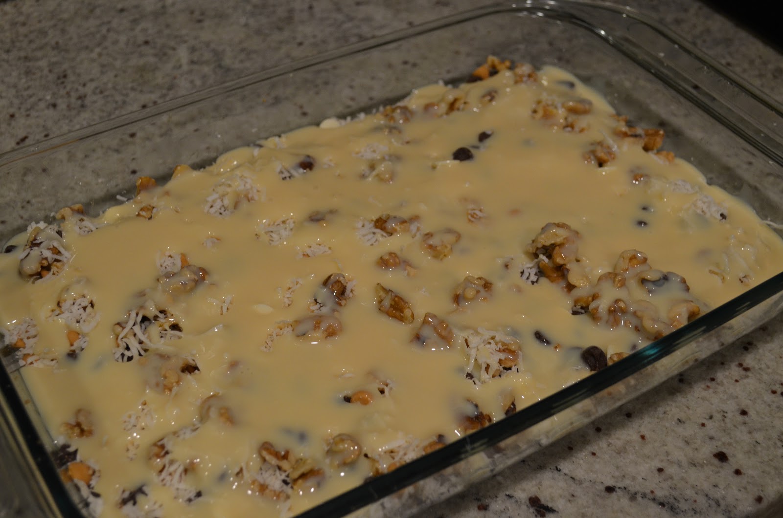 5)Sprinkle chips, nuts, and coconut evenly over graham cracker crust