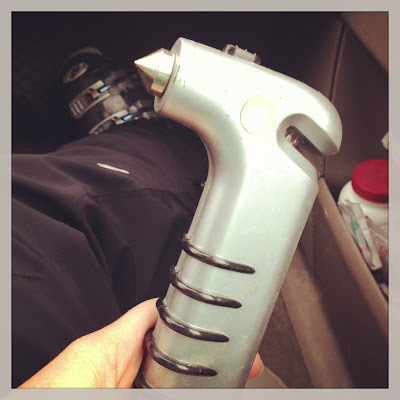 This gadget is called a Seatbelt Cutter Window Breaker Tool on amazon. Come on now?!? You grab the tool, cut the seatbelt, and then break the window as your car is sinking? This is 007 stuff Opa!